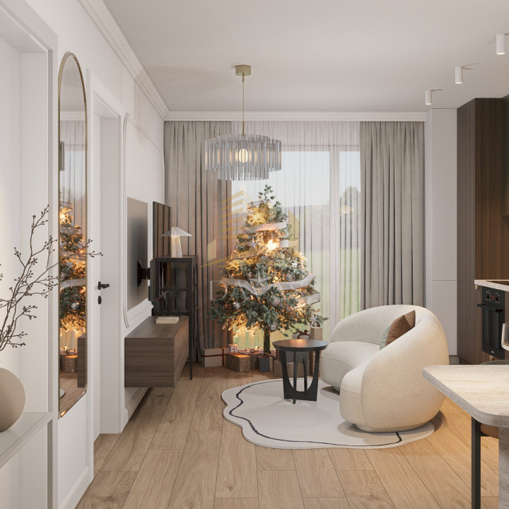 Baia va fi predată conform randărilor, iluminatul din întreg apartamentul și perdele.