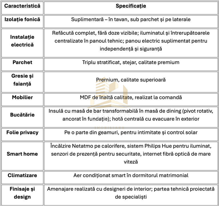 Apartamentul dispune de centrală pe gaz, cuîncălzire controlată smart prin sistemNetatmo în dormitoare, internet prin fibrăoptică de mare viteză, sistem de iluminatinteligent Philips Hue și sistem de securitatesmart cu senzori de prezență. În plus, toatecamerele beneficiază de lumini ambientaleLED